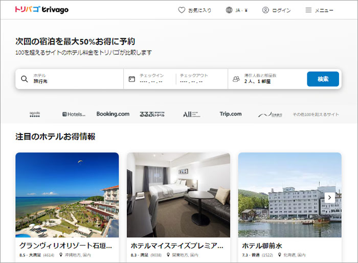 トリバゴとはさまざまな予約サイトが提供する宿泊施設の料金プランを比較するメタサーチエンジンです。